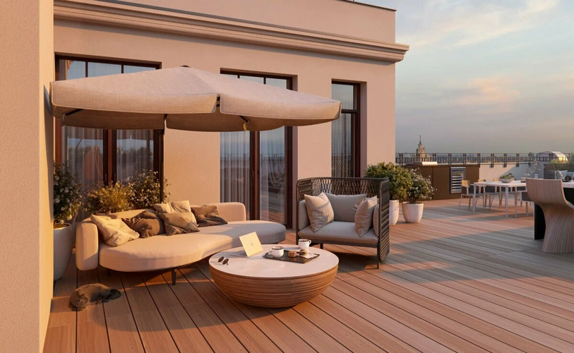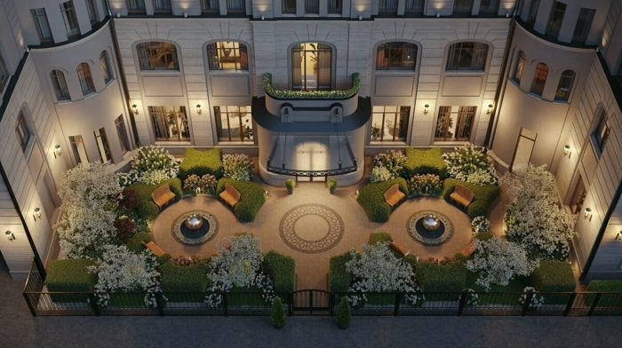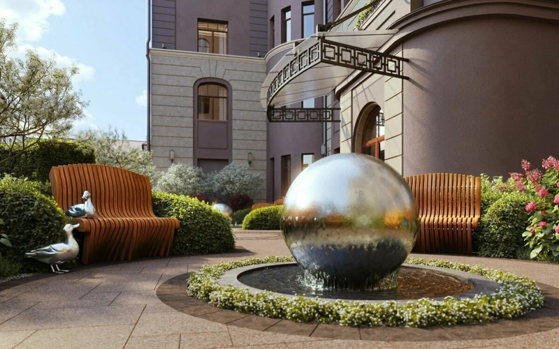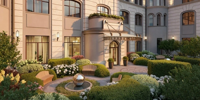 Собственный закрытый двор-сад расположен в глубине квартала и окружён тихими пешеходными переулками, поэтому здесь всегда сохраняется камерная спокойная атмосфера.