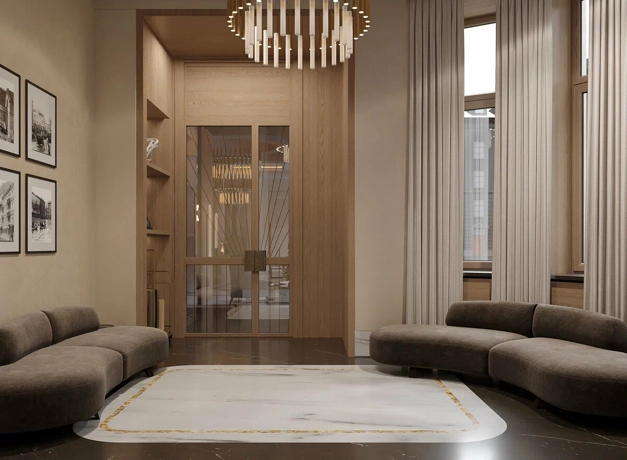 Дом расположен в районе с богатой инфраструктурой. Изысканное лобби: высота потолков — 5,4 метра, лобби-бар, где можно посидеть, выпить кофе или взять его с собой, красивые премиальные лифты, ресепшен с консьержем, комната для водителей, гостевая уборная.