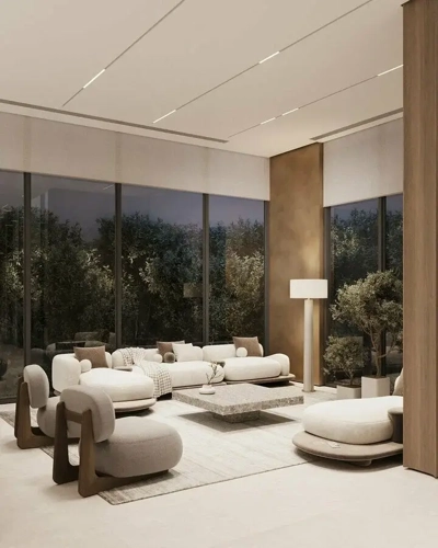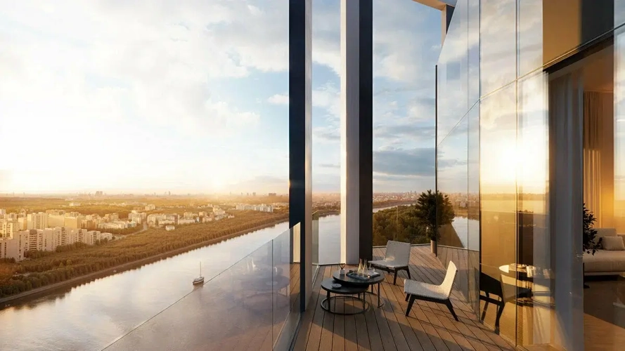 Панорамное остекление в ширину стены комнаты для максимальных видов на реку и парк, которые отрываются уже с первого жилого этажа. В 95% квартир в домах открываются панорамные виды на реку, внутренний парк и набережную.