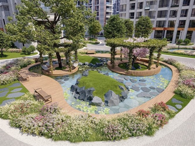 Ландшафтные дизайнеры создавали облик дворового пространства с детскими спортивными площадками, воркаутом, прогулочными аллеями и садом с главными символами природы: землей, воздухом, водой, камнями и растениями.